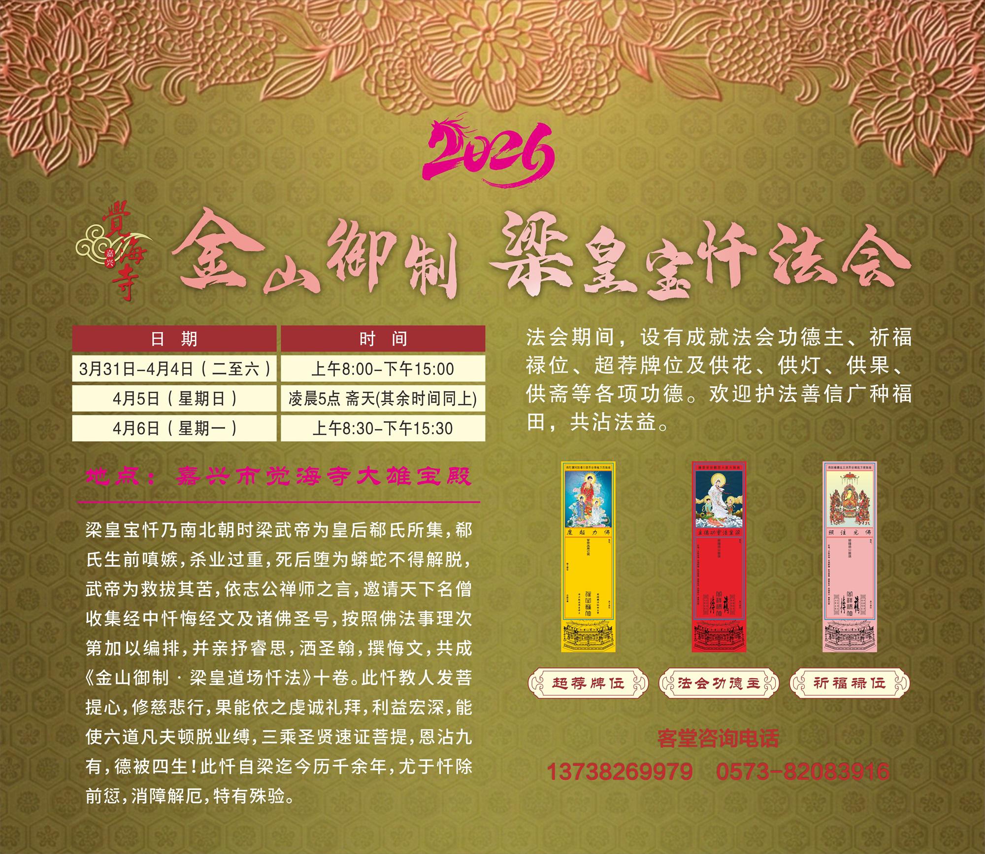 嘉兴市觉海寺定于2026年3月31日至4月6日(农历二月十三至十九),依《金山御制•梁皇宝忏》仪轨,隆重启建二零二六年冥阳两利梁皇宝忏法会七咏日。法会期间,护法善信将在常住法师引领下,虔诚礼拜、随文入观,发露忏悔、涤除尘垢,以此功德祈愿世界和平、国泰民安,护法檀越消灾免难、福慧双增,平安吉祥。梁皇宝忏的功德利益,在于至诚恳切之心。如法礼拜者,现世得身心安康、事业顺遂;过去先亡可藉此超升,冤亲债主咸得解脱。所谓“罪从心起将心忏,心若灭时罪亦亡”,只要发露忏悔、后不再造,必蒙诸佛加被,灾消吉至。